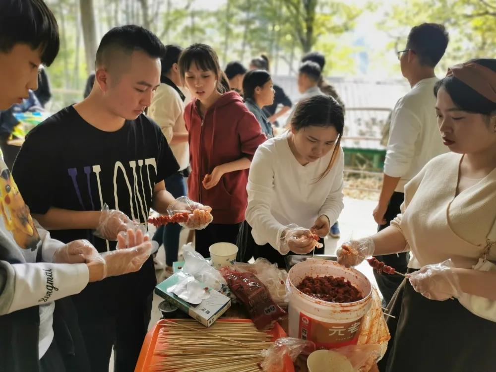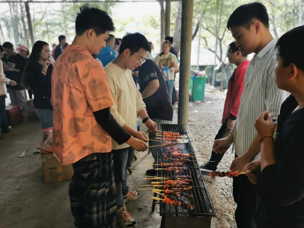 忙碌而充實(shí)的上午稍縱即逝,中午開始享受午餐,午餐準(zhǔn)備的是燒烤,配有小吃、水果、飲料、炒菜與米飯。大家自己動手,分工明確,有穿肉串的,有刷油撒作料的,配合默契,隊(duì)伍里有燒烤達(dá)人,也有菜鳥小白,大家彼此相互借鑒學(xué)習(xí)燒烤經(jīng)驗(yàn),吃貨們也被彌漫周圍的燒烤香味引得口水直流,你嬉我笑,同事間的情誼隨著縷縷炊煙逐漸升華。