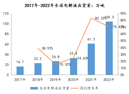 鋰電池電解液產(chǎn)業(yè)的迅速擴大來源于新能源汽車的迅猛發(fā)展,同時儲能鋰電池逐漸步入規(guī)?;l(fā)展階段,新興消費電子領域鋰電池需求持續(xù)提升,也顯著刺激鋰電池電解液出貨量的增長。根據(jù)高工產(chǎn)研鋰電研究所調研數(shù)據(jù)顯示,2022年全球電解液出貨量達到104.3萬噸,同比增長70.42%,市場規(guī)模達到146.73億美元。