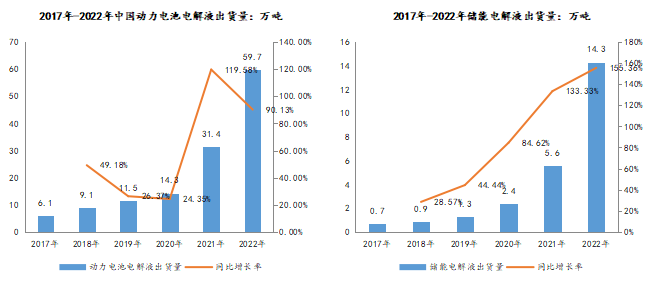 而2022年中國電解液出貨量達到89.1萬噸,同比增長75.74%,在全球電解液中的占比增長至85.43%。其中,中國動力電池出貨量480GWh,帶動中國動力電解液出貨量達到59.7萬噸,同比增長90.13%;中國儲能鋰電池市場出貨量130GWh,帶動儲能電解液出貨量達到14.3萬噸,同比增長155.36%。