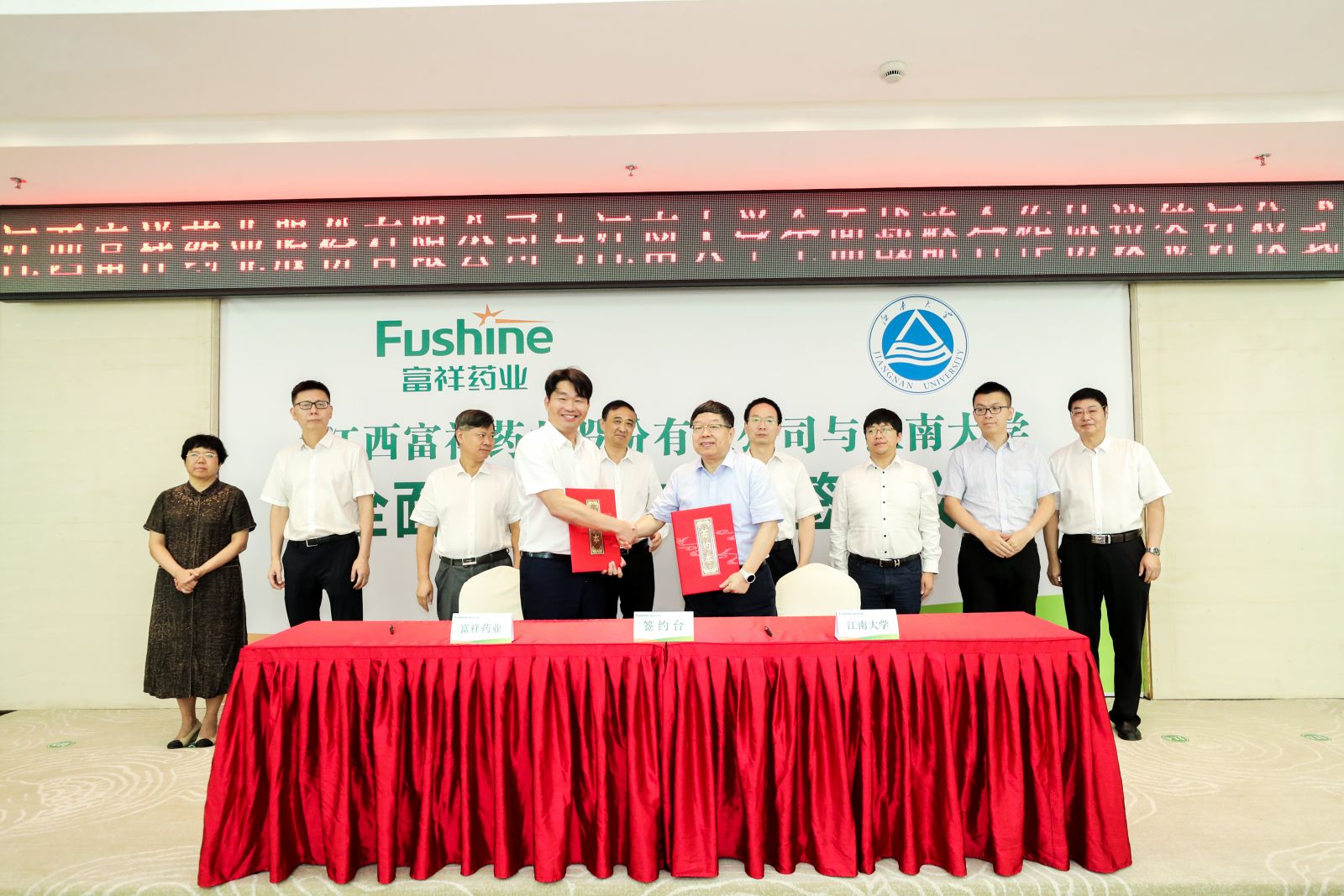 9月3日,江西富祥藥業(yè)股份有限公司與江南大學(xué)全面戰(zhàn)略合作協(xié)議簽訂儀式在景德鎮(zhèn)舉行。市委書記劉鋒,江南大學(xué)原校長、中國工程院院士陳堅(jiān),江南大學(xué)副校長、長江學(xué)者特聘教授堵國成,市人大常委會副主任、市委秘書長羅建國,副市長、高新區(qū)黨工委書記羅文軍、富祥藥業(yè)董事長包建華等出席儀式。高新區(qū)管委會主任、昌江區(qū)委書記倪衛(wèi)春主持儀式。市科技局黨組書記虞萍、副董事長李惠躍、董事程榮武以及公司高管、江南大學(xué)博士參加儀式。